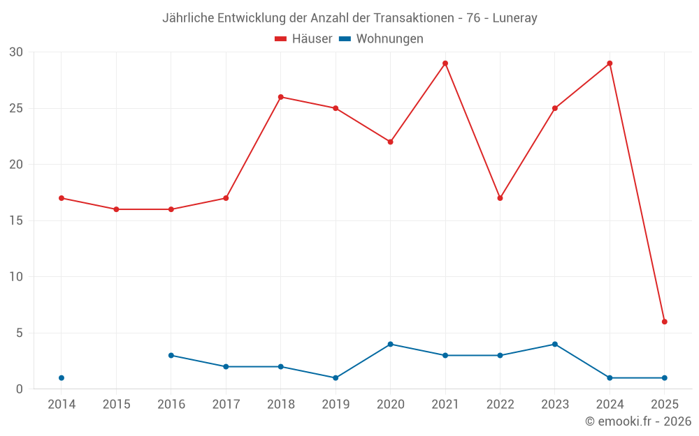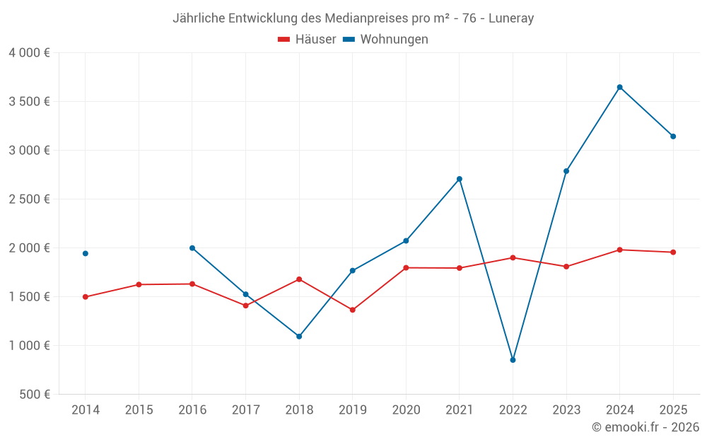 Der Durchschnittspreis auf den 19 Hausgeschäften der letzten 12 Monate in der Gemeinde Luneray betrug 1 822 € pro Quadratmeter für einen mittleren Immobilienwert von 150 000 €. Über diesen Zeitraum hinweg lagen 60% der Transaktionen zwischen 1 431 und 2 571 € pro Quadratmeter (vom 2. bis zum 8. Dezil).