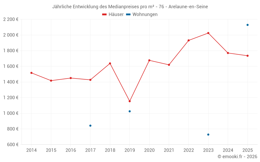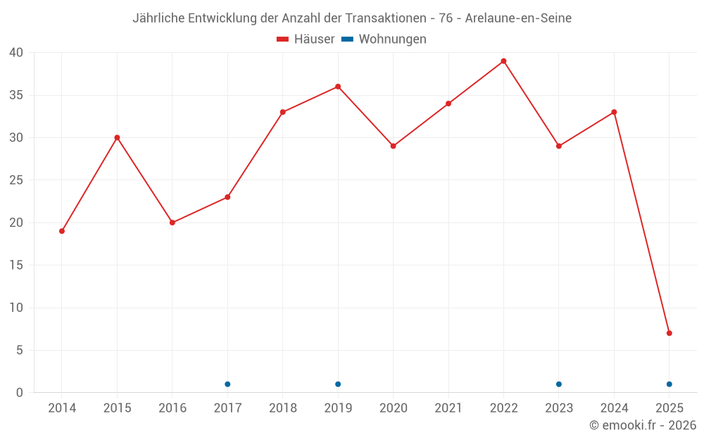 Der Durchschnittspreis auf den 30 Hausgeschäften der letzten 12 Monate in der Gemeinde Arelaune-en-Seine betrug 1 754 € pro Quadratmeter für einen mittleren Immobilienwert von 172 500 €. Über diesen Zeitraum hinweg lagen 60% der Transaktionen zwischen 1 444 und 2 254 € pro Quadratmeter (vom 2. bis zum 8. Dezil).