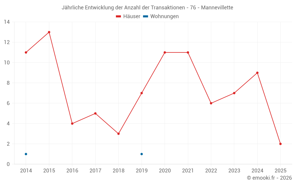 Der Durchschnittspreis auf den 14 Hausgeschäften der letzten 24 Monate in der Gemeinde Mannevillette betrug 2 474 € pro Quadratmeter für einen mittleren Immobilienwert von 253 850 €. Über diesen Zeitraum hinweg lagen 60% der Transaktionen zwischen 2 107 und 3 110 € pro Quadratmeter (vom 2. bis zum 8. Dezil).