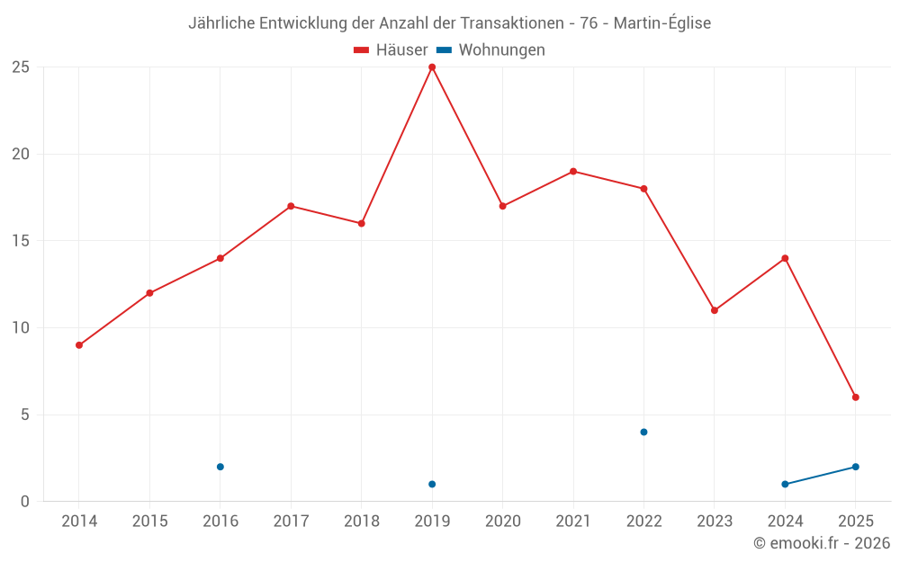 Der Durchschnittspreis auf den 24 Hausgeschäften der letzten 24 Monate in der Gemeinde Martin-Église betrug 2 166 € pro Quadratmeter für einen mittleren Immobilienwert von 221 450 €. Über diesen Zeitraum hinweg lagen 60% der Transaktionen zwischen 1 723 und 2 631 € pro Quadratmeter (vom 2. bis zum 8. Dezil).
