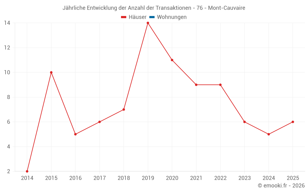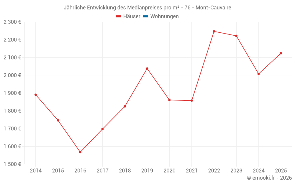 Der Durchschnittspreis auf den 16 Hausgeschäften der letzten 24 Monate in der Gemeinde Mont-Cauvaire betrug 2 106 € pro Quadratmeter für einen mittleren Immobilienwert von 219 700 €. Über diesen Zeitraum hinweg lagen 60% der Transaktionen zwischen 1 948 und 2 500 € pro Quadratmeter (vom 2. bis zum 8. Dezil).