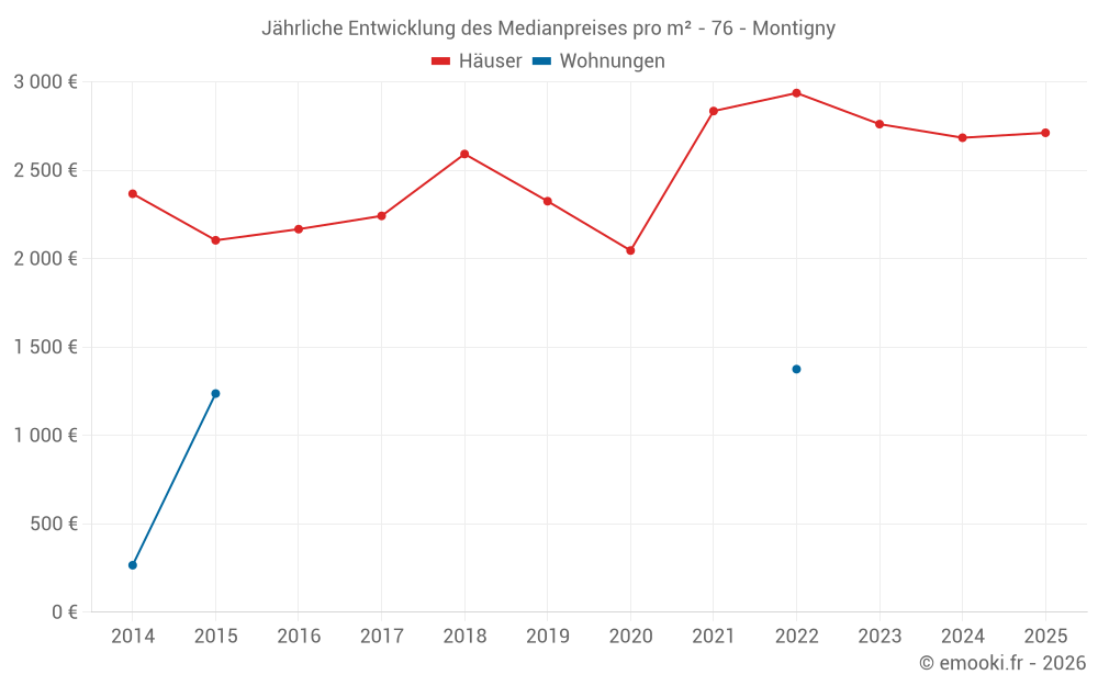 Der Durchschnittspreis auf den 17 Hausgeschäften der letzten 12 Monate in der Gemeinde Montigny betrug 3 077 € pro Quadratmeter für einen mittleren Immobilienwert von 370 000 €. Über diesen Zeitraum hinweg lagen 60% der Transaktionen zwischen 2 168 und 4 039 € pro Quadratmeter (vom 2. bis zum 8. Dezil).