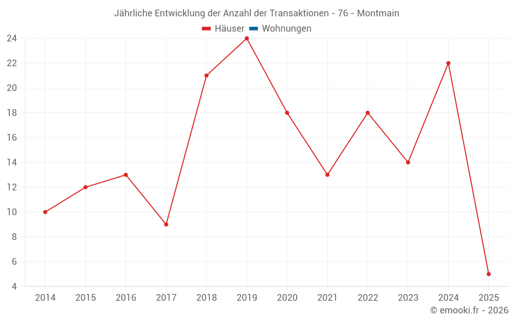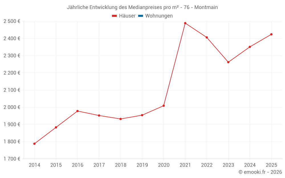 Der Durchschnittspreis auf den 16 Hausgeschäften der letzten 12 Monate in der Gemeinde Montmain betrug 2 376 € pro Quadratmeter für einen mittleren Immobilienwert von 238 500 €. Über diesen Zeitraum hinweg lagen 60% der Transaktionen zwischen 2 117 und 2 500 € pro Quadratmeter (vom 2. bis zum 8. Dezil).
