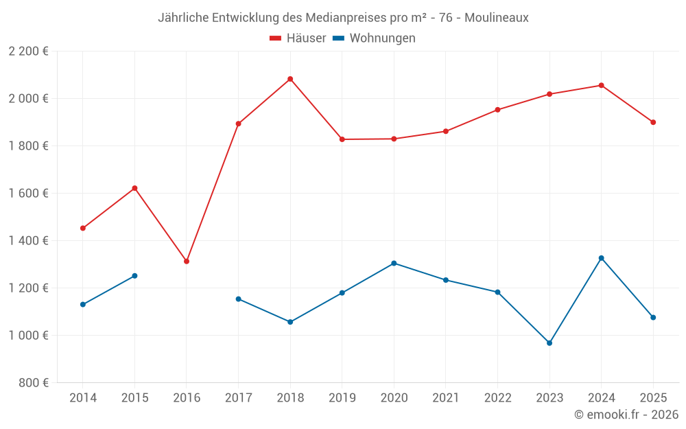 Der Durchschnittspreis auf den 18 Hausgeschäften der letzten 24 Monate in der Gemeinde Moulineaux betrug 1 986 € pro Quadratmeter für einen mittleren Immobilienwert von 192 300 €. Über diesen Zeitraum hinweg lagen 60% der Transaktionen zwischen 1 792 und 2 403 € pro Quadratmeter (vom 2. bis zum 8. Dezil).