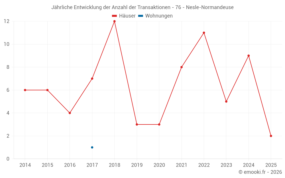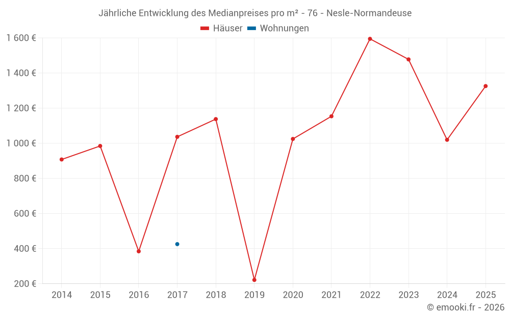 Der Durchschnittspreis auf den 15 Hausgeschäften der letzten 24 Monate in der Gemeinde Nesle-Normandeuse betrug 1 304 € pro Quadratmeter für einen mittleren Immobilienwert von 88 000 €. Über diesen Zeitraum hinweg lagen 60% der Transaktionen zwischen 683 und 1 490 € pro Quadratmeter (vom 2. bis zum 8. Dezil).