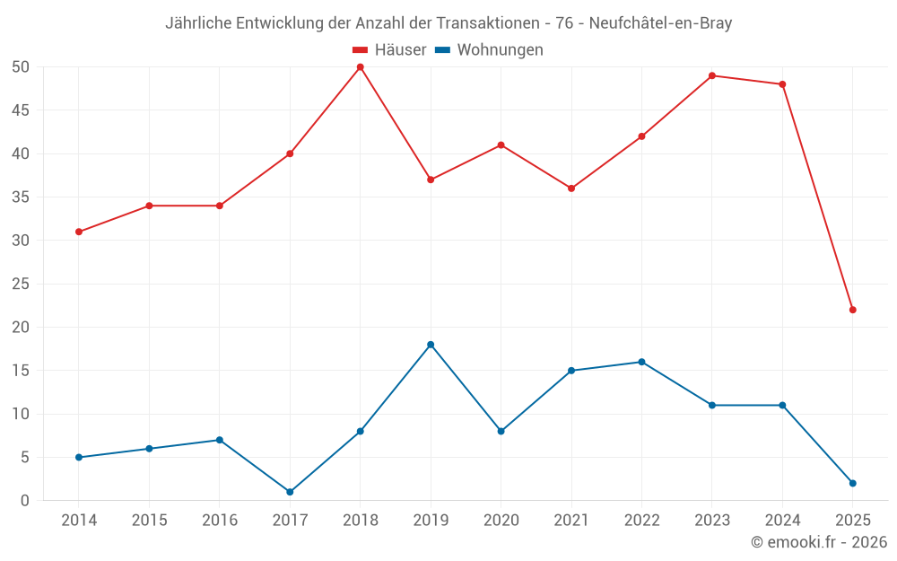 Der Durchschnittspreis auf den 22 Hausgeschäften der letzten 6 Monate in der Gemeinde Neufchâtel-en-Bray betrug 1 674 € pro Quadratmeter für einen mittleren Immobilienwert von 168 750 €. Über diesen Zeitraum hinweg lagen 60% der Transaktionen zwischen 1 258 und 2 533 € pro Quadratmeter (vom 2. bis zum 8. Dezil).
