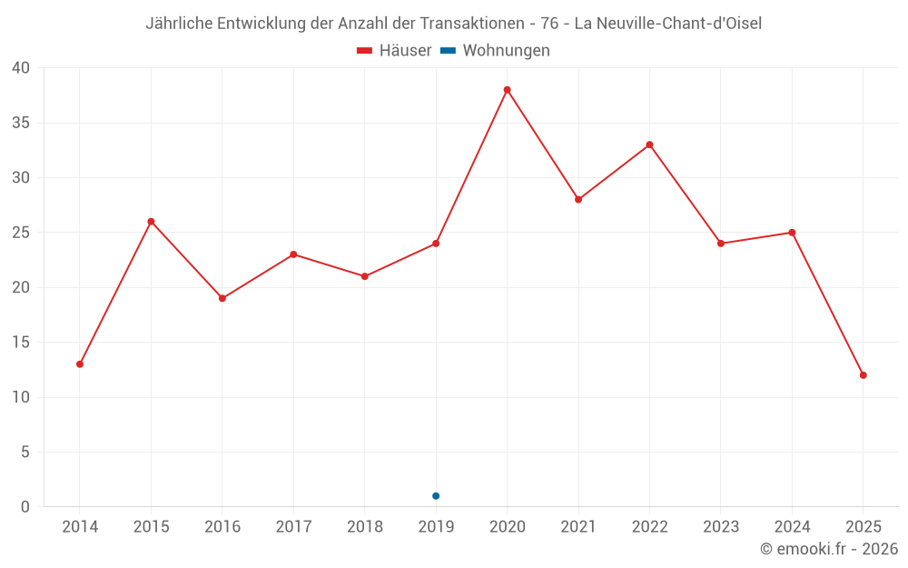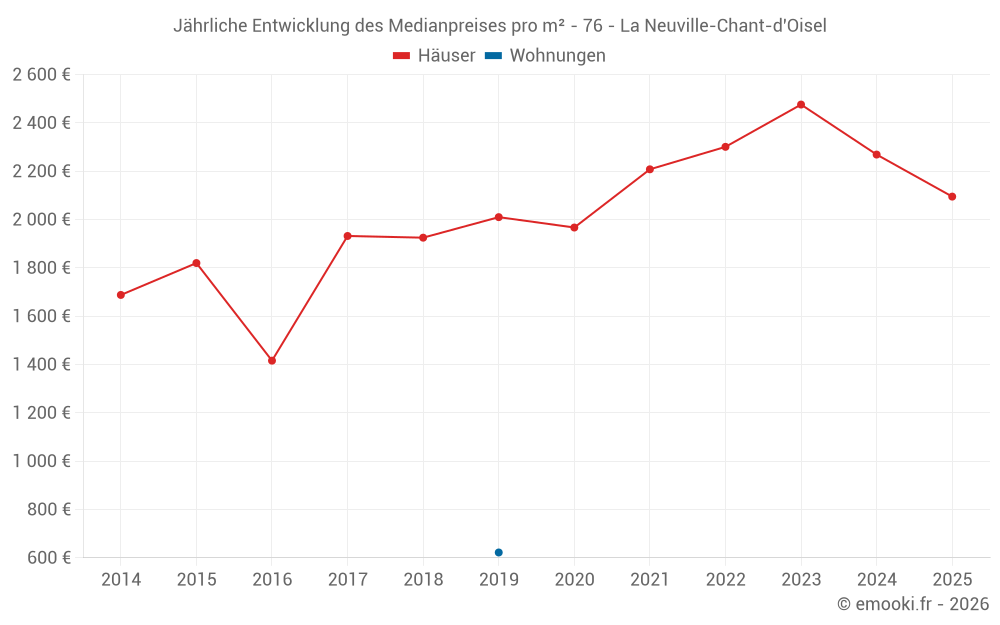 Der Durchschnittspreis auf den 24 Hausgeschäften der letzten 12 Monate in der Gemeinde La Neuville-Chant-d'Oisel betrug 2 177 € pro Quadratmeter für einen mittleren Immobilienwert von 254 350 €. Über diesen Zeitraum hinweg lagen 60% der Transaktionen zwischen 1 774 und 2 838 € pro Quadratmeter (vom 2. bis zum 8. Dezil).