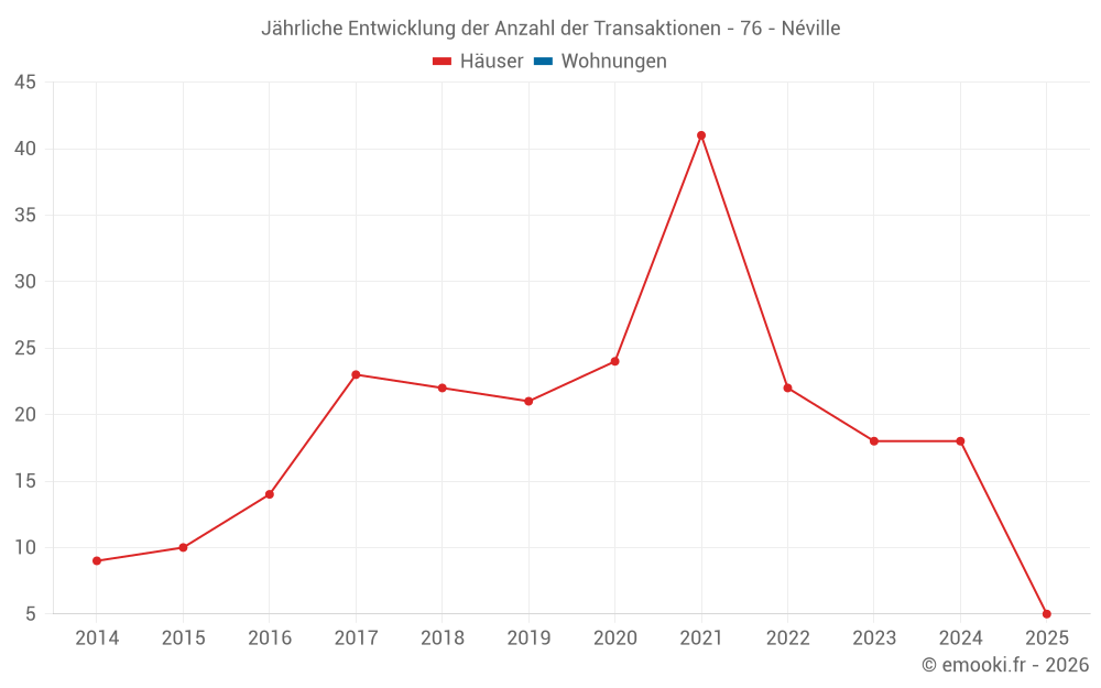 Der Durchschnittspreis auf den 18 Hausgeschäften der letzten 12 Monate in der Gemeinde Néville betrug 1 978 € pro Quadratmeter für einen mittleren Immobilienwert von 171 375 €. Über diesen Zeitraum hinweg lagen 60% der Transaktionen zwischen 1 170 und 2 510 € pro Quadratmeter (vom 2. bis zum 8. Dezil).