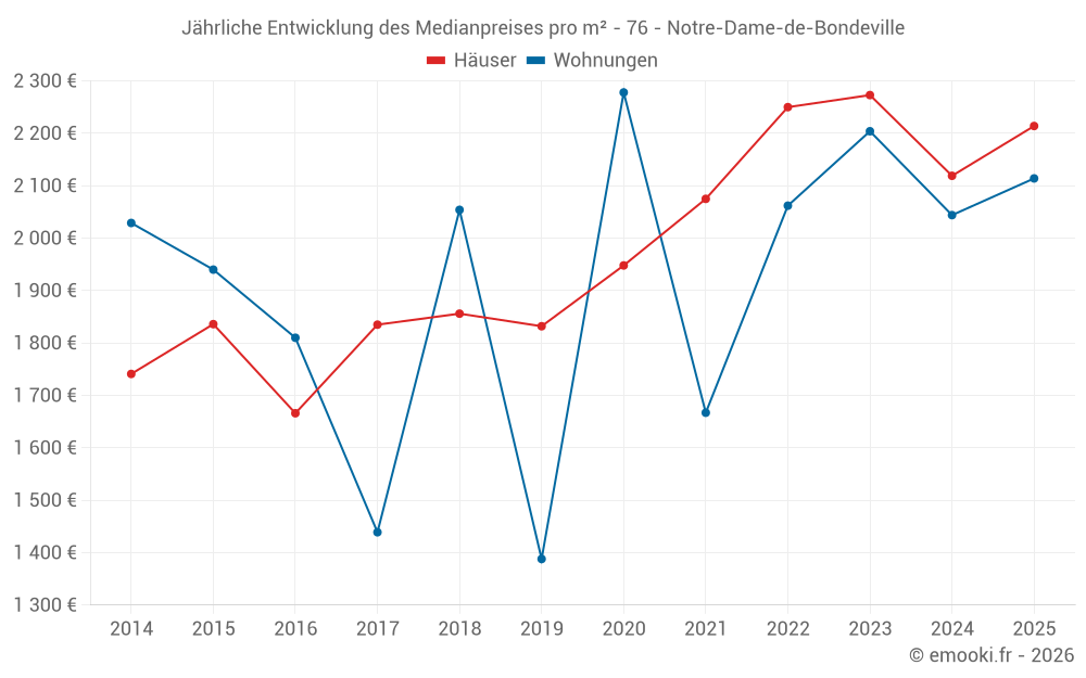 Der Durchschnittspreis auf den 16 Wohnungstransaktionen der letzten 12 Monate in der Gemeinde Notre-Dame-de-Bondeville betrug 2 176 € pro Quadratmeter für einen mittleren Immobilienwert von 94 500 €. Über diesen Zeitraum hinweg lagen 60% der Transaktionen zwischen 1 762 und 2 357 € pro Quadratmeter (vom 2. bis zum 8. Dezil).