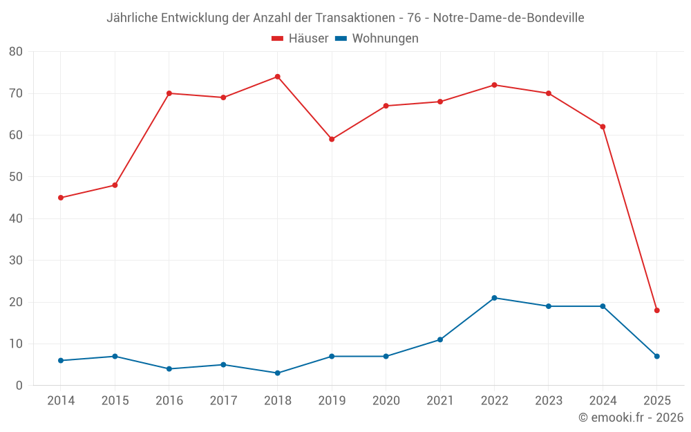Der Durchschnittspreis auf den 18 Hausgeschäften der letzten 6 Monate in der Gemeinde Notre-Dame-de-Bondeville betrug 2 214 € pro Quadratmeter für einen mittleren Immobilienwert von 178 100 €. Über diesen Zeitraum hinweg lagen 60% der Transaktionen zwischen 1 928 und 2 426 € pro Quadratmeter (vom 2. bis zum 8. Dezil).