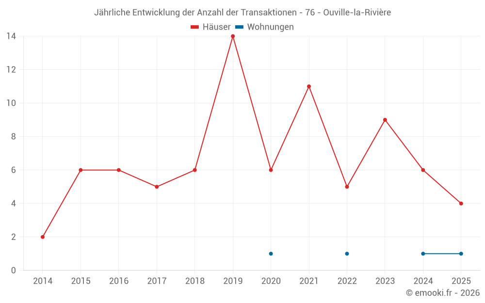 Der Durchschnittspreis auf den 16 Hausgeschäften der letzten 24 Monate in der Gemeinde Ouville-la-Rivière betrug 1 817 € pro Quadratmeter für einen mittleren Immobilienwert von 147 500 €. Über diesen Zeitraum hinweg lagen 60% der Transaktionen zwischen 988 und 2 081 € pro Quadratmeter (vom 2. bis zum 8. Dezil).