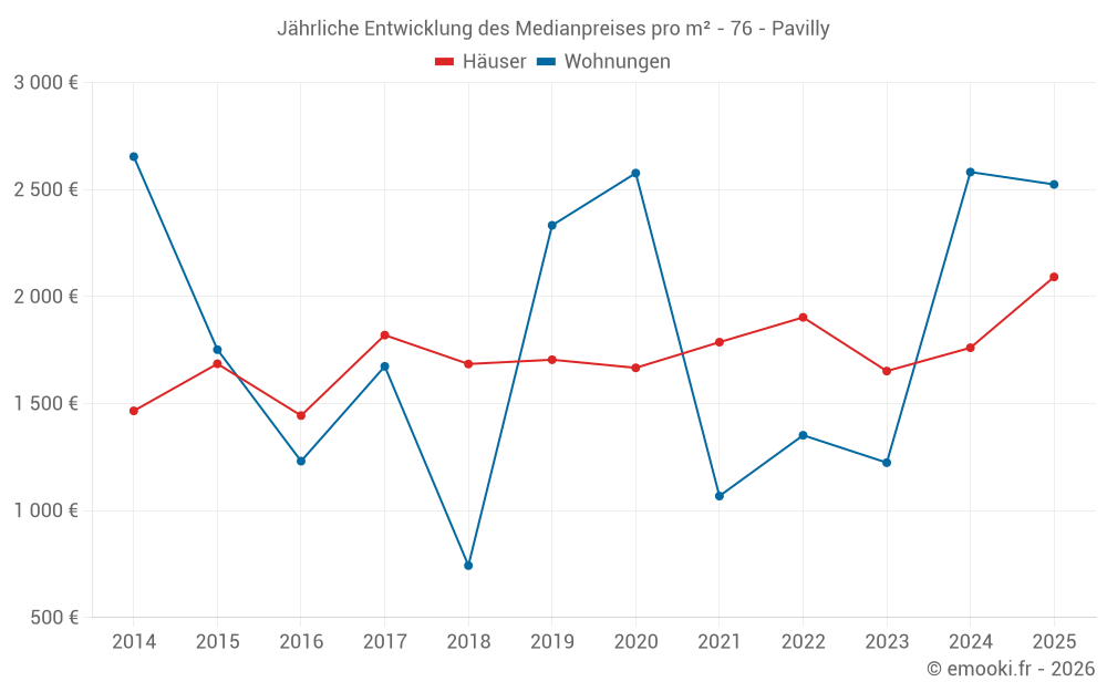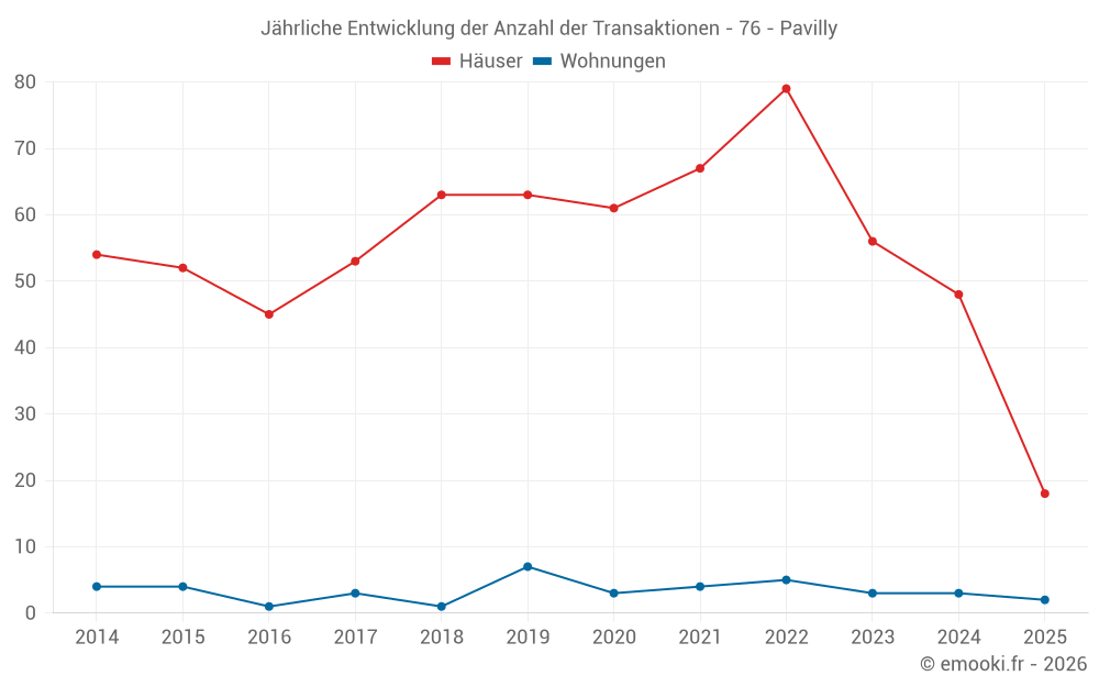 Der Durchschnittspreis auf den 18 Hausgeschäften der letzten 6 Monate in der Gemeinde Pavilly betrug 2 092 € pro Quadratmeter für einen mittleren Immobilienwert von 155 000 €. Über diesen Zeitraum hinweg lagen 60% der Transaktionen zwischen 1 568 und 2 409 € pro Quadratmeter (vom 2. bis zum 8. Dezil).
