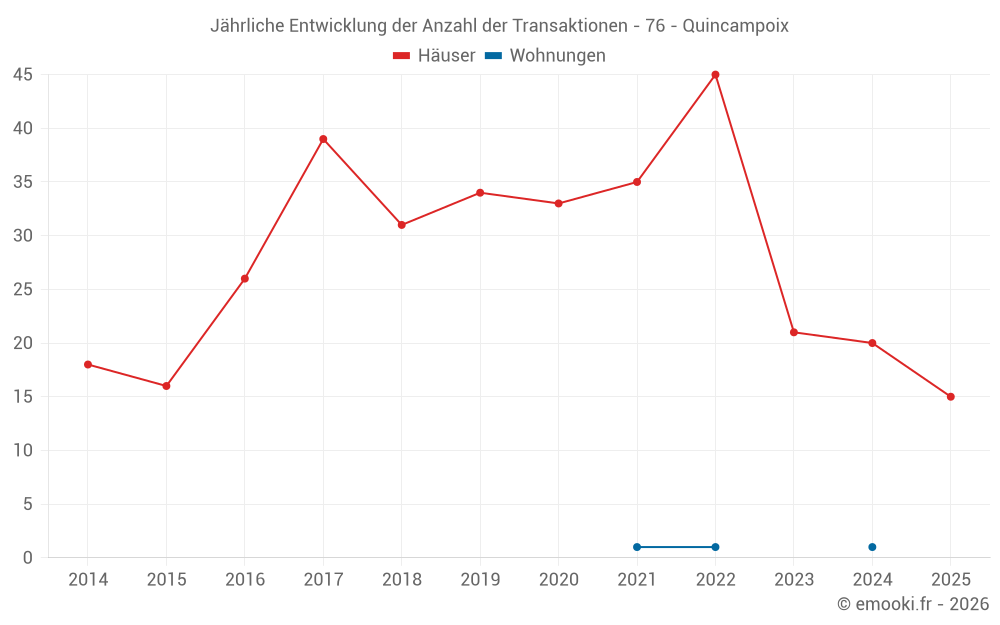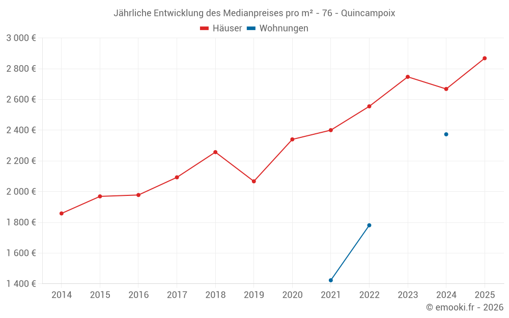 Der Durchschnittspreis auf den 25 Hausgeschäften der letzten 12 Monate in der Gemeinde Quincampoix betrug 2 846 € pro Quadratmeter für einen mittleren Immobilienwert von 337 800 €. Über diesen Zeitraum hinweg lagen 60% der Transaktionen zwischen 2 310 und 3 172 € pro Quadratmeter (vom 2. bis zum 8. Dezil).