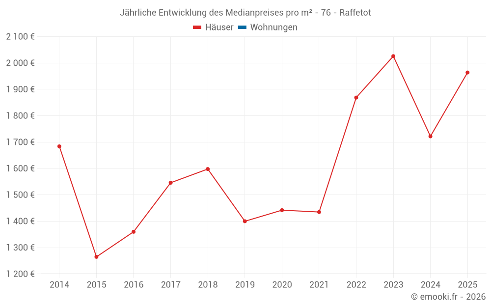 Der Durchschnittspreis auf den 16 Hausgeschäften der letzten 24 Monate in der Gemeinde Raffetot betrug 1 725 € pro Quadratmeter für einen mittleren Immobilienwert von 160 725 €. Über diesen Zeitraum hinweg lagen 60% der Transaktionen zwischen 1 300 und 2 435 € pro Quadratmeter (vom 2. bis zum 8. Dezil).