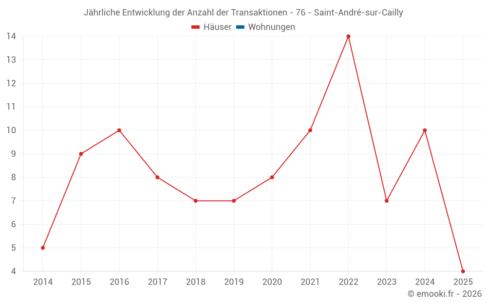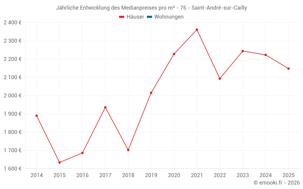 Der Durchschnittspreis auf den 19 Hausgeschäften der letzten 24 Monate in der Gemeinde Saint-André-sur-Cailly betrug 2 174 € pro Quadratmeter für einen mittleren Immobilienwert von 244 000 €. Über diesen Zeitraum hinweg lagen 60% der Transaktionen zwischen 1 788 und 2 571 € pro Quadratmeter (vom 2. bis zum 8. Dezil).