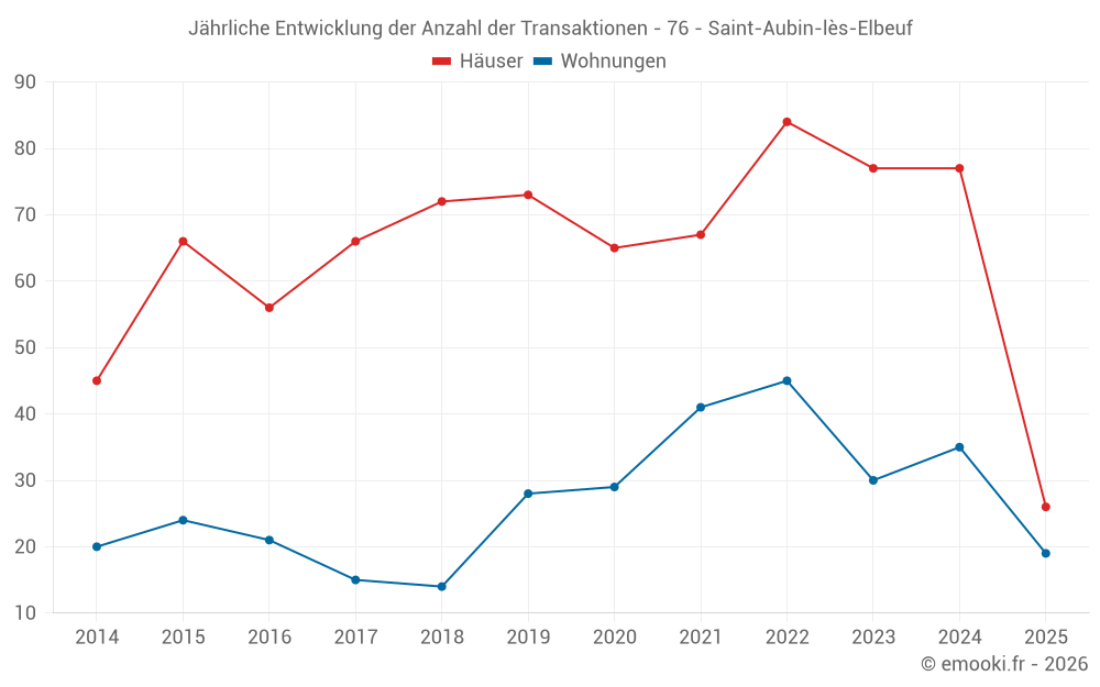Der Durchschnittspreis auf den 19 Wohnungstransaktionen der letzten 6 Monate in der Gemeinde Saint-Aubin-lès-Elbeuf betrug 1 073 € pro Quadratmeter für einen mittleren Immobilienwert von 72 000 €. Über diesen Zeitraum hinweg lagen 60% der Transaktionen zwischen 829 und 1 610 € pro Quadratmeter (vom 2. bis zum 8. Dezil).
