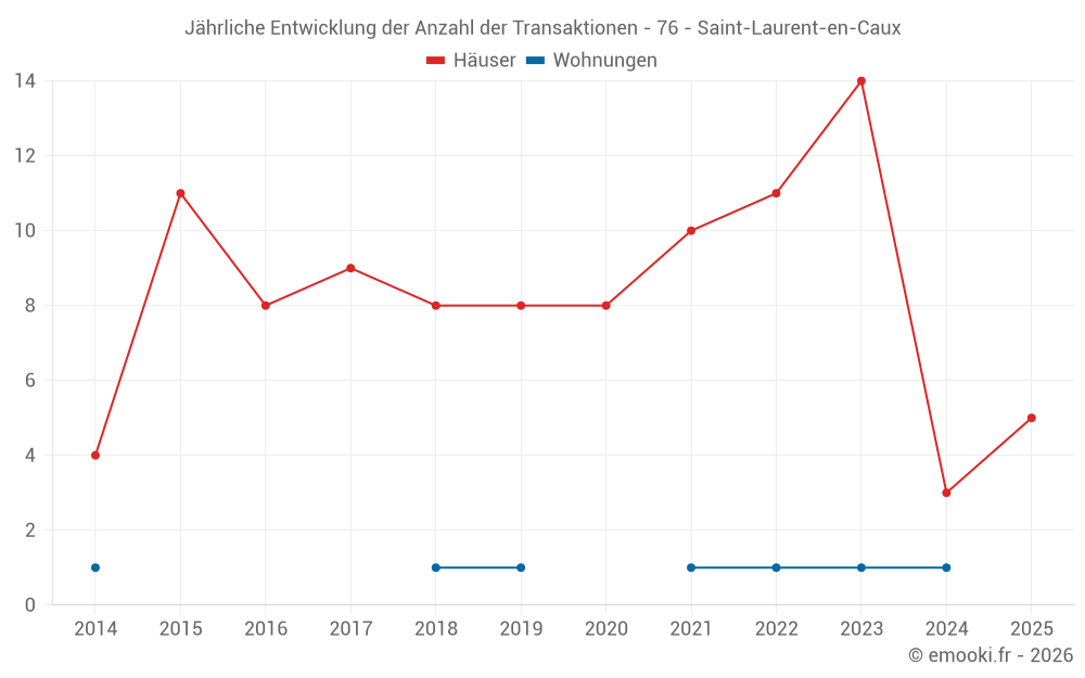 Der Durchschnittspreis auf den 16 Hausgeschäften der letzten 24 Monate in der Gemeinde Saint-Laurent-en-Caux betrug 1 444 € pro Quadratmeter für einen mittleren Immobilienwert von 103 000 €. Über diesen Zeitraum hinweg lagen 60% der Transaktionen zwischen 955 und 2 165 € pro Quadratmeter (vom 2. bis zum 8. Dezil).