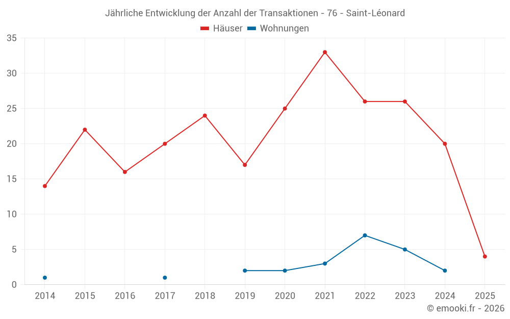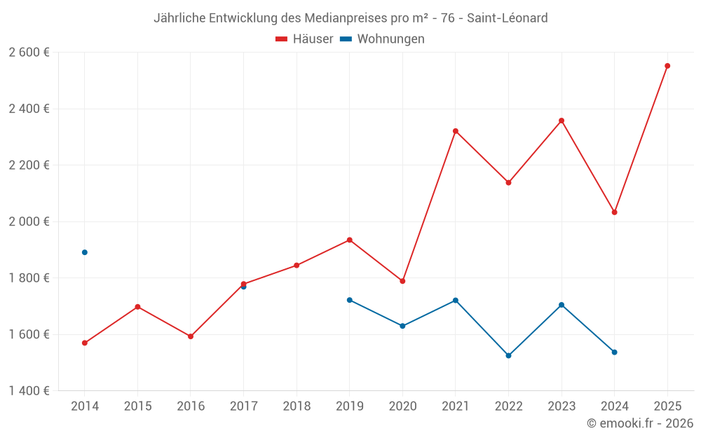 Der Durchschnittspreis auf den 16 Hausgeschäften der letzten 12 Monate in der Gemeinde Saint-Léonard betrug 2 288 € pro Quadratmeter für einen mittleren Immobilienwert von 225 175 €. Über diesen Zeitraum hinweg lagen 60% der Transaktionen zwischen 1 789 und 3 218 € pro Quadratmeter (vom 2. bis zum 8. Dezil).