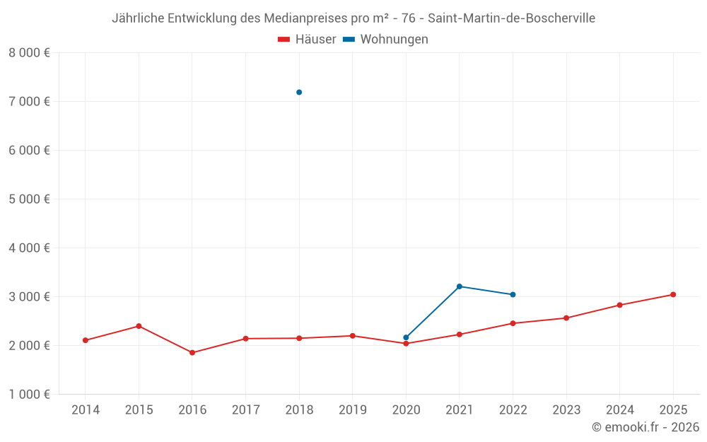 Der Durchschnittspreis auf den 20 Hausgeschäften der letzten 12 Monate in der Gemeinde Saint-Martin-de-Boscherville betrug 2 723 € pro Quadratmeter für einen mittleren Immobilienwert von 327 500 €. Über diesen Zeitraum hinweg lagen 60% der Transaktionen zwischen 2 046 und 3 440 € pro Quadratmeter (vom 2. bis zum 8. Dezil).