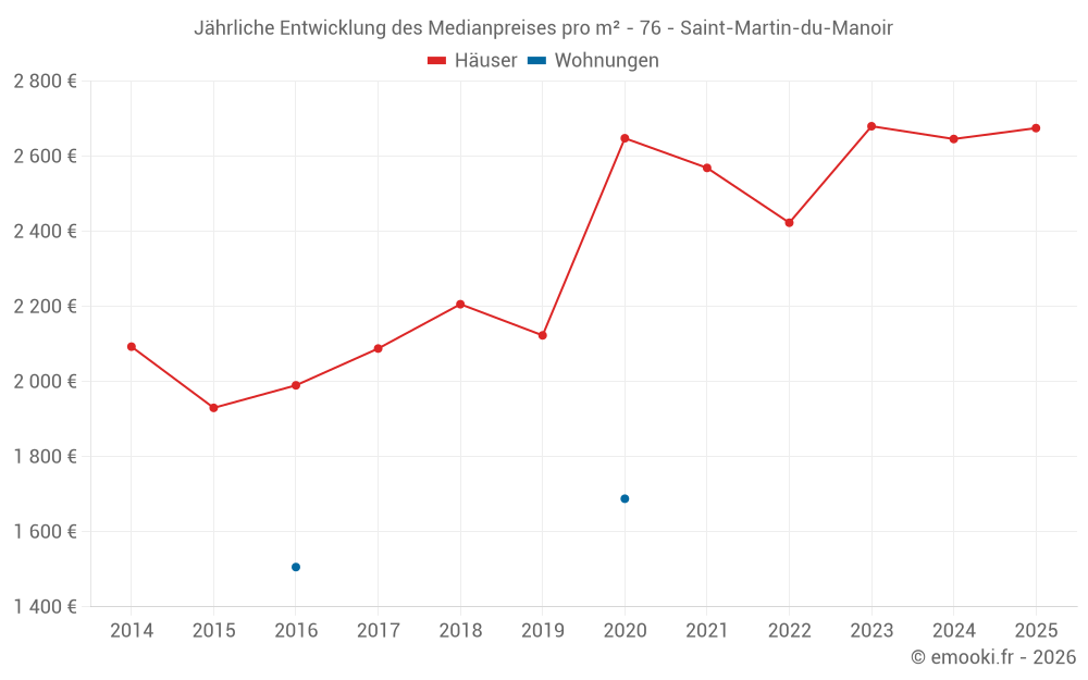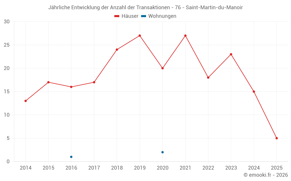 Der Durchschnittspreis auf den 35 Hausgeschäften der letzten 24 Monate in der Gemeinde Saint-Martin-du-Manoir betrug 2 675 € pro Quadratmeter für einen mittleren Immobilienwert von 283 000 €. Über diesen Zeitraum hinweg lagen 60% der Transaktionen zwischen 2 365 und 3 180 € pro Quadratmeter (vom 2. bis zum 8. Dezil).