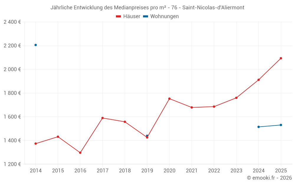 Der Durchschnittspreis auf den 18 Hausgeschäften der letzten 6 Monate in der Gemeinde Saint-Nicolas-d'Aliermont betrug 2 094 € pro Quadratmeter für einen mittleren Immobilienwert von 166 500 €. Über diesen Zeitraum hinweg lagen 60% der Transaktionen zwischen 1 427 und 2 455 € pro Quadratmeter (vom 2. bis zum 8. Dezil).