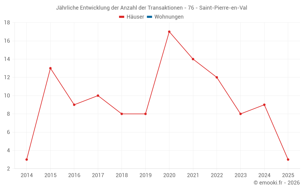 Der Durchschnittspreis auf den 16 Hausgeschäften der letzten 24 Monate in der Gemeinde Saint-Pierre-en-Val betrug 2 004 € pro Quadratmeter für einen mittleren Immobilienwert von 169 500 €. Über diesen Zeitraum hinweg lagen 60% der Transaktionen zwischen 1 766 und 2 271 € pro Quadratmeter (vom 2. bis zum 8. Dezil).