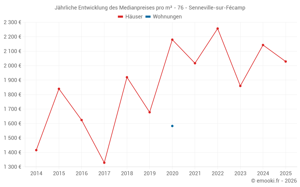 Der Durchschnittspreis auf den 19 Hausgeschäften der letzten 24 Monate in der Gemeinde Senneville-sur-Fécamp betrug 2 143 € pro Quadratmeter für einen mittleren Immobilienwert von 195 000 €. Über diesen Zeitraum hinweg lagen 60% der Transaktionen zwischen 1 520 und 2 625 € pro Quadratmeter (vom 2. bis zum 8. Dezil).