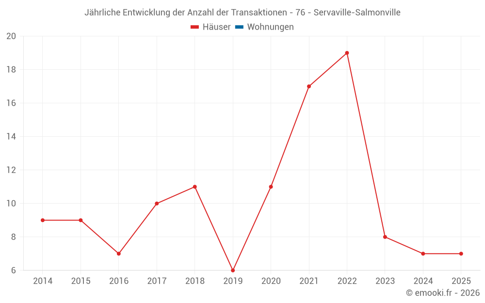 Der Durchschnittspreis auf den 20 Hausgeschäften der letzten 24 Monate in der Gemeinde Servaville-Salmonville betrug 2 134 € pro Quadratmeter für einen mittleren Immobilienwert von 239 750 €. Über diesen Zeitraum hinweg lagen 60% der Transaktionen zwischen 1 671 und 2 569 € pro Quadratmeter (vom 2. bis zum 8. Dezil).