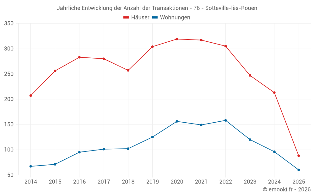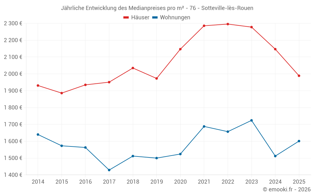 Der Durchschnittspreis auf den 46 Hausgeschäften der letzten 3 Monate in der Gemeinde Sotteville-lès-Rouen betrug 1 864 € pro Quadratmeter für einen mittleren Immobilienwert von 148 500 €. Über diesen Zeitraum hinweg lagen 60% der Transaktionen zwischen 1 472 und 2 386 € pro Quadratmeter (vom 2. bis zum 8. Dezil).