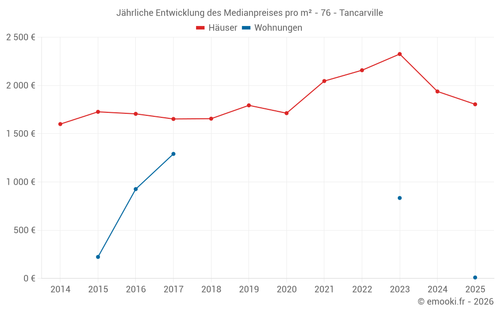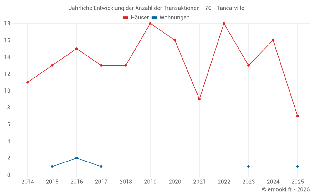 Der Durchschnittspreis auf den 31 Hausgeschäften der letzten 24 Monate in der Gemeinde Tancarville betrug 1 966 € pro Quadratmeter für einen mittleren Immobilienwert von 175 000 €. Über diesen Zeitraum hinweg lagen 60% der Transaktionen zwischen 1 375 und 2 467 € pro Quadratmeter (vom 2. bis zum 8. Dezil).