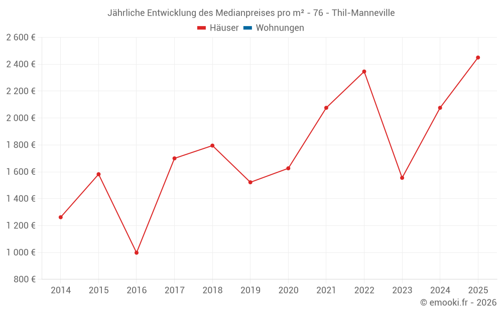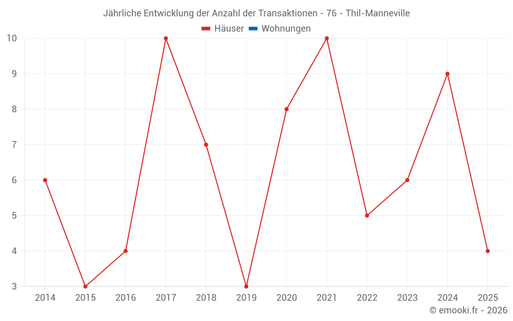 Der Durchschnittspreis auf den 15 Hausgeschäften der letzten 24 Monate in der Gemeinde Thil-Manneville betrug 2 107 € pro Quadratmeter für einen mittleren Immobilienwert von 200 920 €. Über diesen Zeitraum hinweg lagen 60% der Transaktionen zwischen 1 473 und 2 488 € pro Quadratmeter (vom 2. bis zum 8. Dezil).