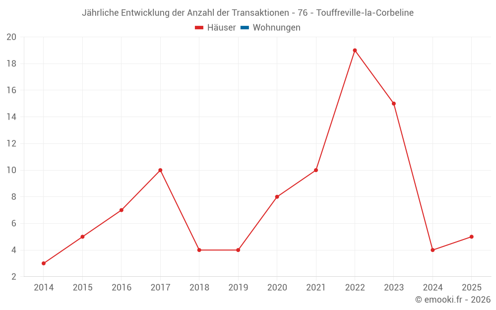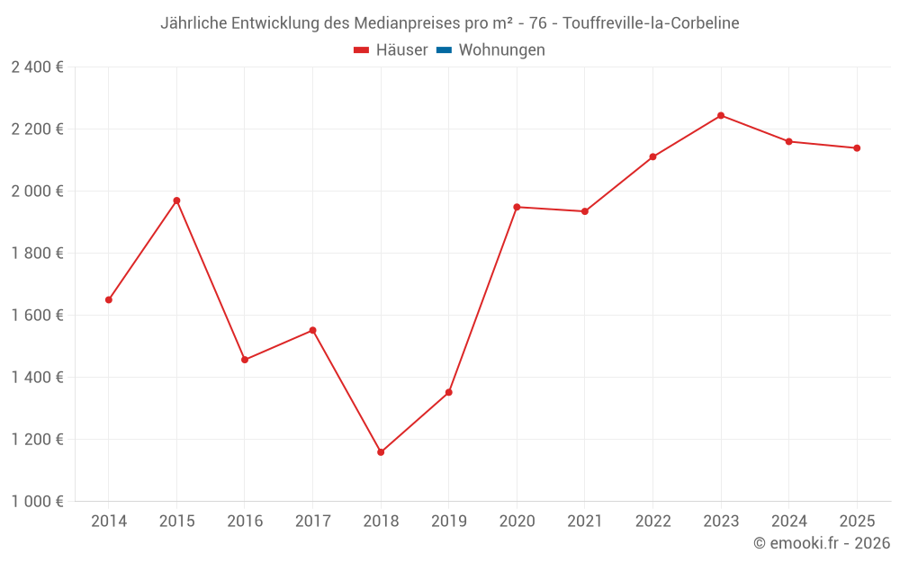 Der Durchschnittspreis auf den 21 Hausgeschäften der letzten 24 Monate in der Gemeinde Touffreville-la-Corbeline betrug 2 271 € pro Quadratmeter für einen mittleren Immobilienwert von 195 000 €. Über diesen Zeitraum hinweg lagen 60% der Transaktionen zwischen 2 025 und 2 675 € pro Quadratmeter (vom 2. bis zum 8. Dezil).