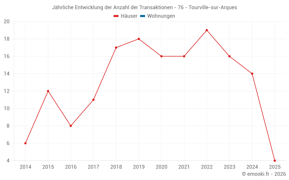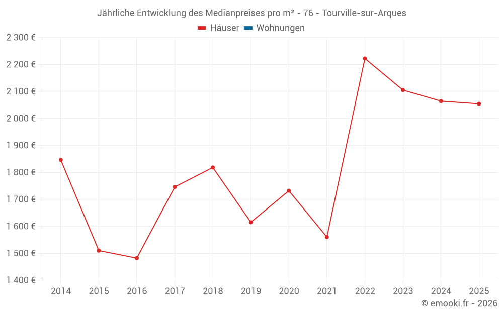 Der Durchschnittspreis auf den 27 Hausgeschäften der letzten 24 Monate in der Gemeinde Tourville-sur-Arques betrug 2 075 € pro Quadratmeter für einen mittleren Immobilienwert von 213 850 €. Über diesen Zeitraum hinweg lagen 60% der Transaktionen zwischen 1 480 und 2 316 € pro Quadratmeter (vom 2. bis zum 8. Dezil).