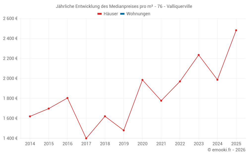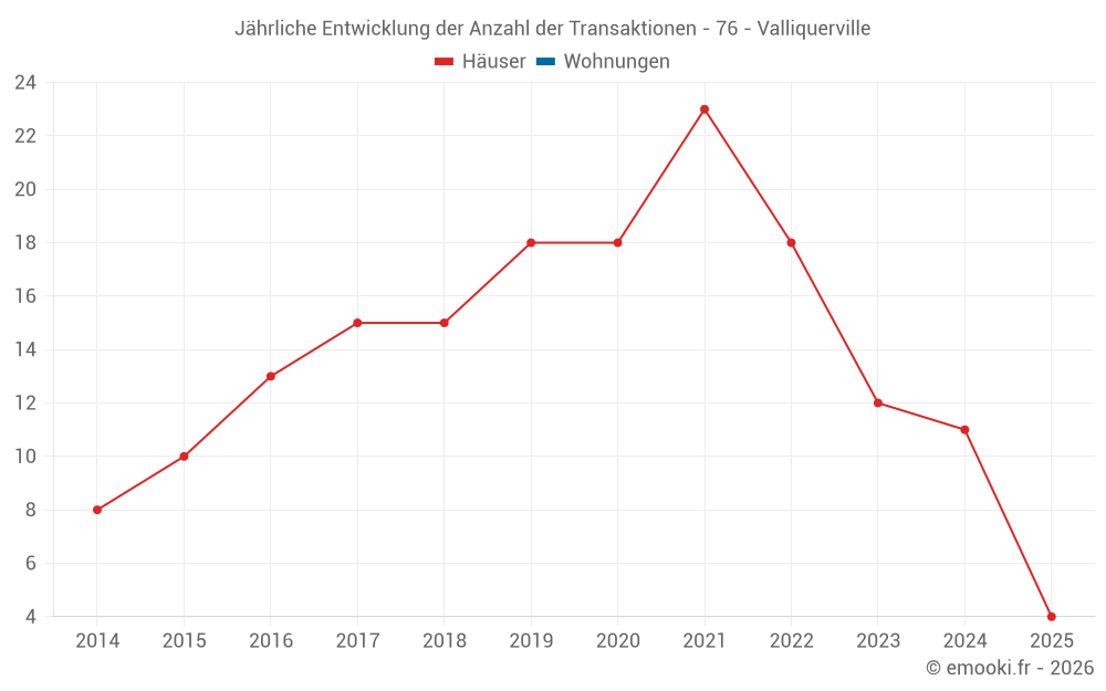 Der Durchschnittspreis auf den 20 Hausgeschäften der letzten 24 Monate in der Gemeinde Valliquerville betrug 2 172 € pro Quadratmeter für einen mittleren Immobilienwert von 182 000 €. Über diesen Zeitraum hinweg lagen 60% der Transaktionen zwischen 1 693 und 2 718 € pro Quadratmeter (vom 2. bis zum 8. Dezil).