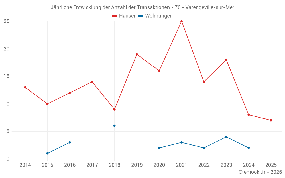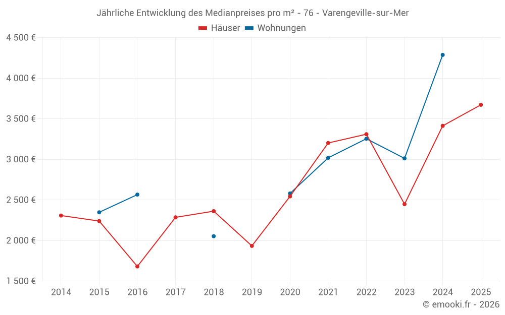 Der Durchschnittspreis auf den 24 Hausgeschäften der letzten 24 Monate in der Gemeinde Varengeville-sur-Mer betrug 2 701 € pro Quadratmeter für einen mittleren Immobilienwert von 305 000 €. Über diesen Zeitraum hinweg lagen 60% der Transaktionen zwischen 2 059 und 4 504 € pro Quadratmeter (vom 2. bis zum 8. Dezil).