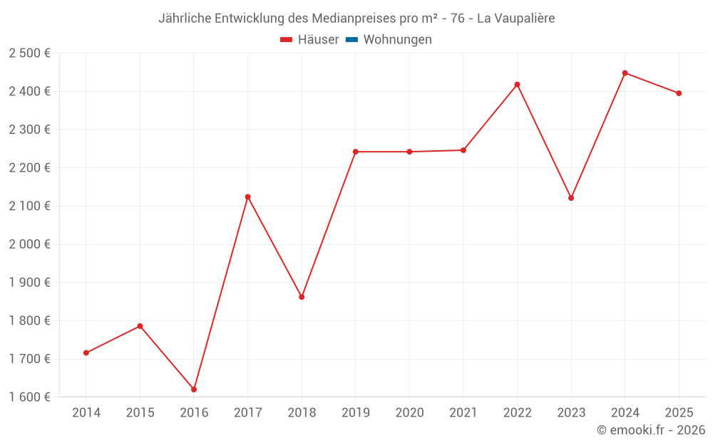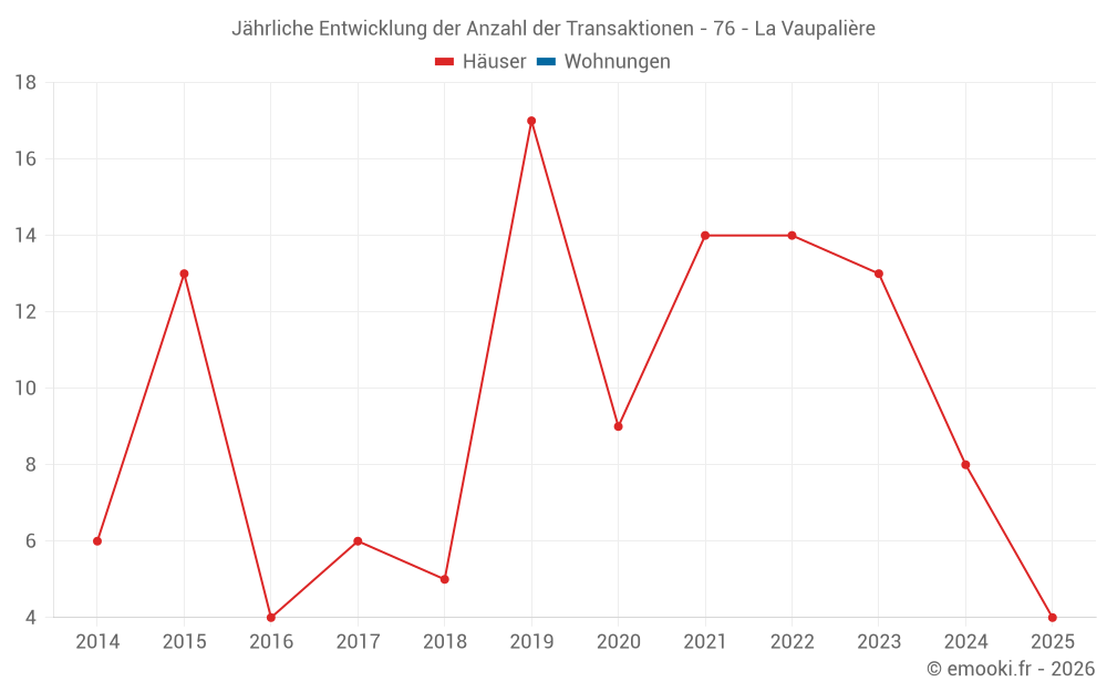 Der Durchschnittspreis auf den 16 Hausgeschäften der letzten 24 Monate in der Gemeinde La Vaupalière betrug 2 334 € pro Quadratmeter für einen mittleren Immobilienwert von 220 000 €. Über diesen Zeitraum hinweg lagen 60% der Transaktionen zwischen 1 919 und 2 526 € pro Quadratmeter (vom 2. bis zum 8. Dezil).