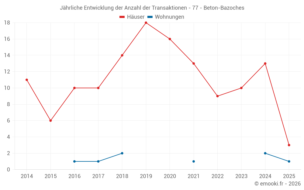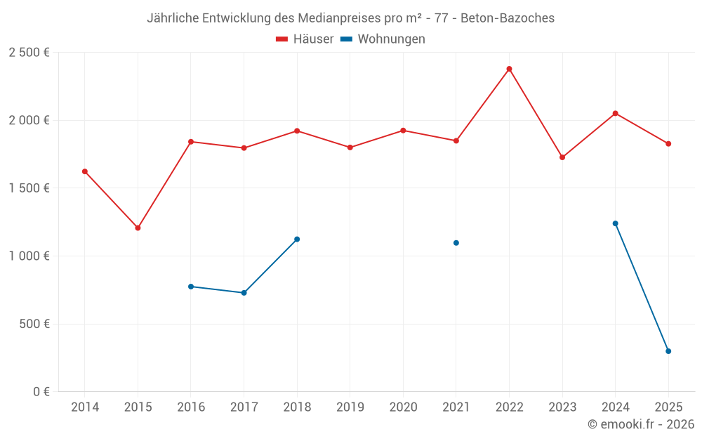 Der Durchschnittspreis auf den 20 Hausgeschäften der letzten 24 Monate in der Gemeinde Beton-Bazoches betrug 1 921 € pro Quadratmeter für einen mittleren Immobilienwert von 186 500 €. Über diesen Zeitraum hinweg lagen 60% der Transaktionen zwischen 1 672 und 2 237 € pro Quadratmeter (vom 2. bis zum 8. Dezil).