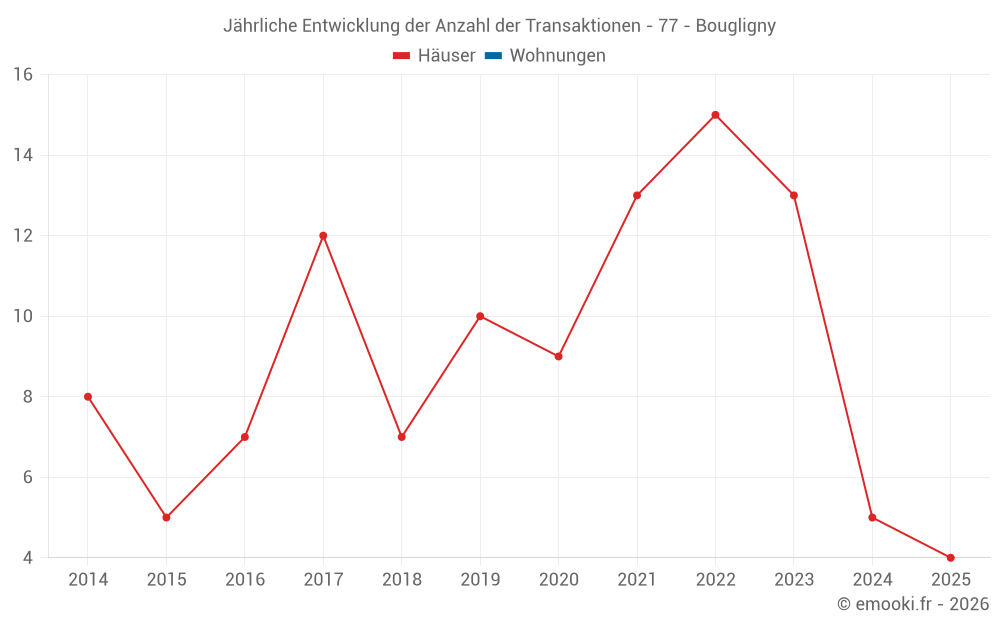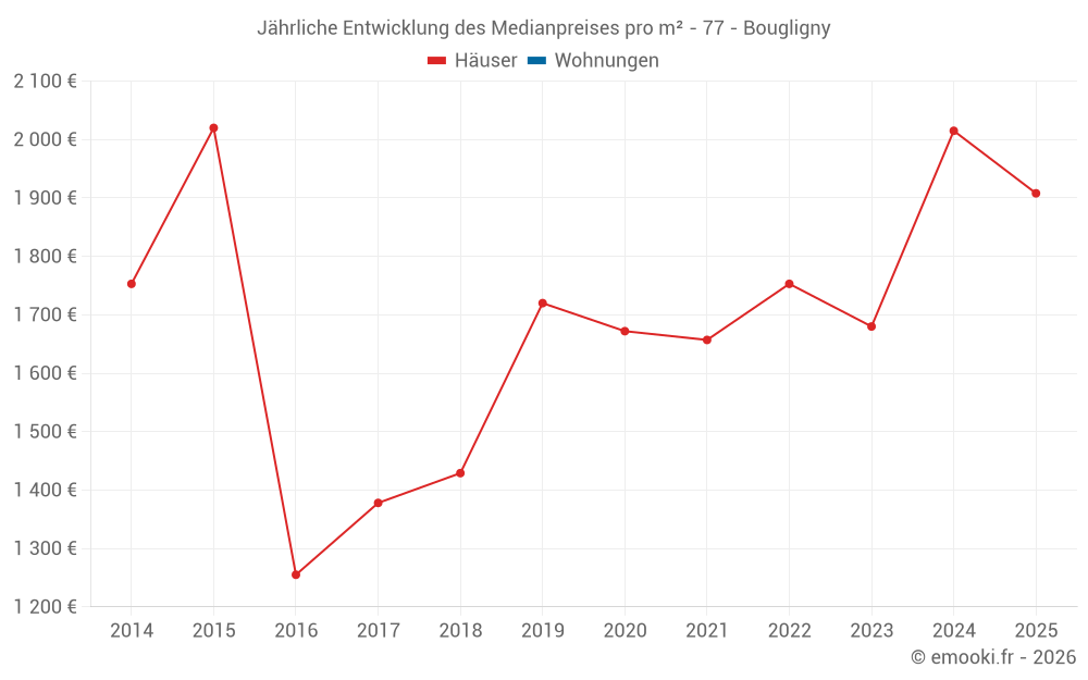 Der Durchschnittspreis auf den 16 Hausgeschäften der letzten 24 Monate in der Gemeinde Bougligny betrug 1 678 € pro Quadratmeter für einen mittleren Immobilienwert von 190 000 €. Über diesen Zeitraum hinweg lagen 60% der Transaktionen zwischen 1 359 und 2 213 € pro Quadratmeter (vom 2. bis zum 8. Dezil).