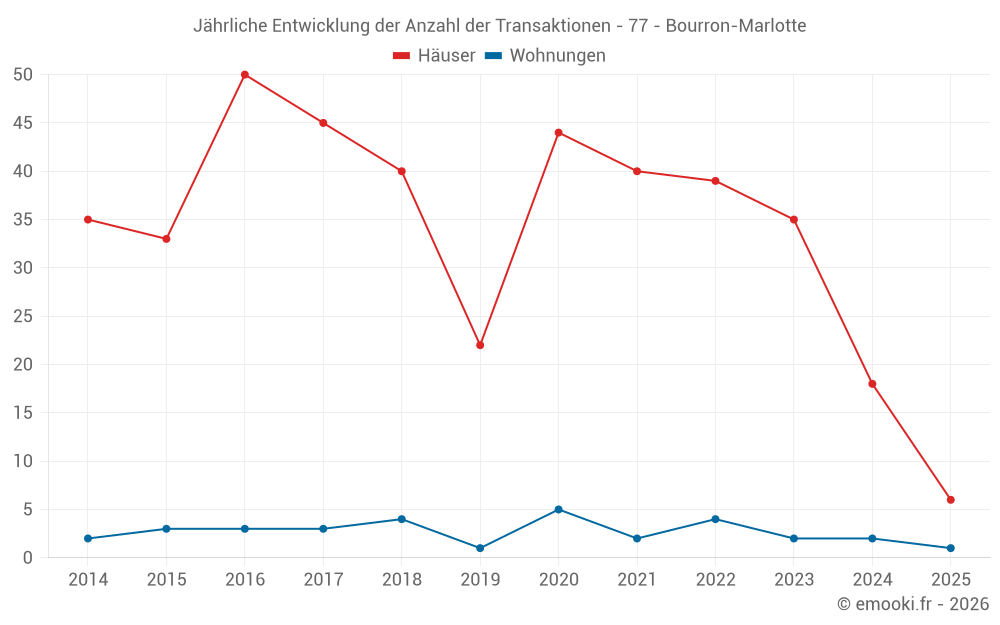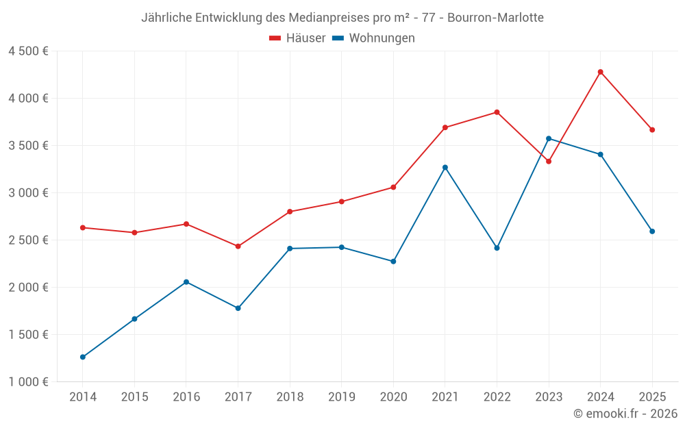 Der Durchschnittspreis auf den 18 Hausgeschäften der letzten 12 Monate in der Gemeinde Bourron-Marlotte betrug 4 090 € pro Quadratmeter für einen mittleren Immobilienwert von 517 100 €. Über diesen Zeitraum hinweg lagen 60% der Transaktionen zwischen 3 438 und 4 822 € pro Quadratmeter (vom 2. bis zum 8. Dezil).