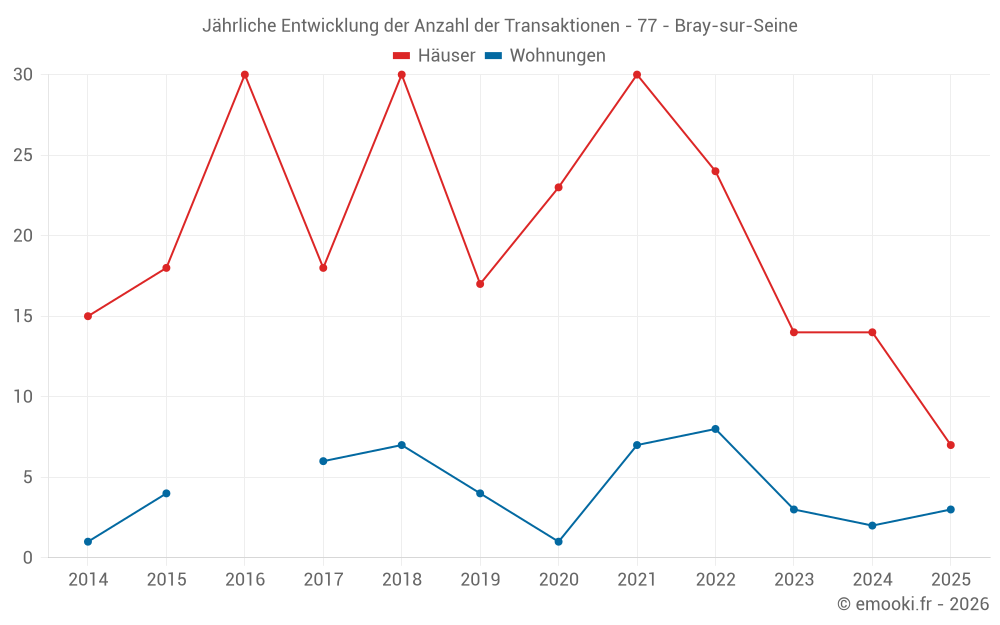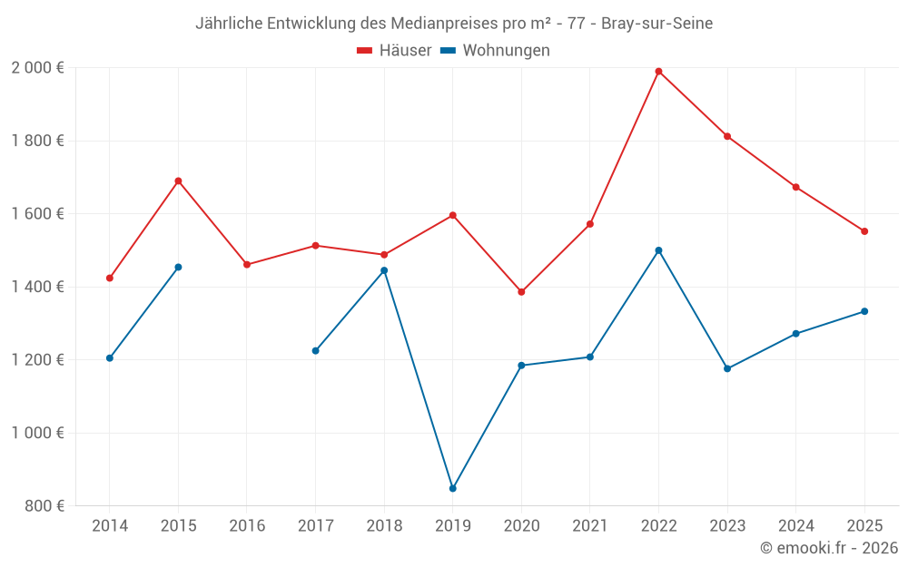 Der Durchschnittspreis auf den 18 Hausgeschäften der letzten 12 Monate in der Gemeinde Bray-sur-Seine betrug 1 673 € pro Quadratmeter für einen mittleren Immobilienwert von 149 000 €. Über diesen Zeitraum hinweg lagen 60% der Transaktionen zwischen 1 292 und 2 232 € pro Quadratmeter (vom 2. bis zum 8. Dezil).
