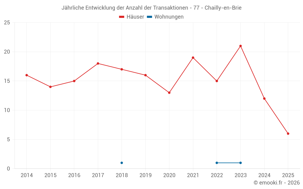 Der Durchschnittspreis auf den 27 Hausgeschäften der letzten 24 Monate in der Gemeinde Chailly-en-Brie betrug 2 024 € pro Quadratmeter für einen mittleren Immobilienwert von 214 520 €. Über diesen Zeitraum hinweg lagen 60% der Transaktionen zwischen 1 442 und 2 600 € pro Quadratmeter (vom 2. bis zum 8. Dezil).