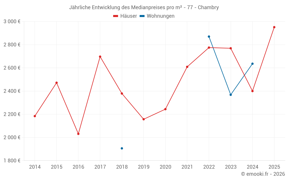 Der Durchschnittspreis auf den 19 Hausgeschäften der letzten 24 Monate in der Gemeinde Chambry betrug 2 400 € pro Quadratmeter für einen mittleren Immobilienwert von 250 000 €. Über diesen Zeitraum hinweg lagen 60% der Transaktionen zwischen 1 602 und 3 300 € pro Quadratmeter (vom 2. bis zum 8. Dezil).