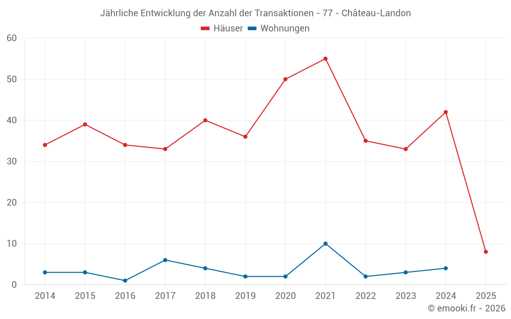 Der Durchschnittspreis auf den 31 Hausgeschäften der letzten 12 Monate in der Gemeinde Château-Landon betrug 1 633 € pro Quadratmeter für einen mittleren Immobilienwert von 160 000 €. Über diesen Zeitraum hinweg lagen 60% der Transaktionen zwischen 1 190 und 2 479 € pro Quadratmeter (vom 2. bis zum 8. Dezil).