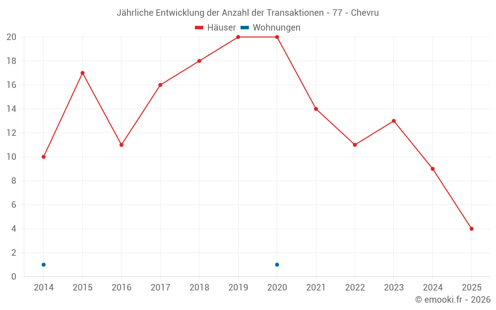 Der Durchschnittspreis auf den 19 Hausgeschäften der letzten 24 Monate in der Gemeinde Chevru betrug 1 792 € pro Quadratmeter für einen mittleren Immobilienwert von 227 100 €. Über diesen Zeitraum hinweg lagen 60% der Transaktionen zwischen 1 254 und 2 302 € pro Quadratmeter (vom 2. bis zum 8. Dezil).