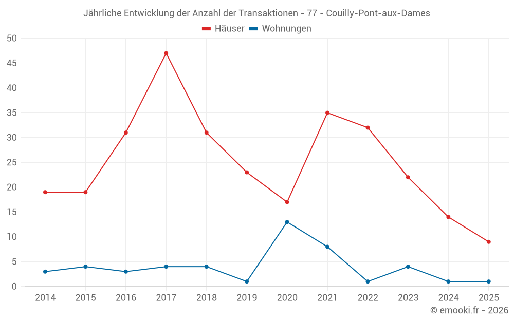 Der Durchschnittspreis auf den 18 Hausgeschäften der letzten 12 Monate in der Gemeinde Couilly-Pont-aux-Dames betrug 3 123 € pro Quadratmeter für einen mittleren Immobilienwert von 315 000 €. Über diesen Zeitraum hinweg lagen 60% der Transaktionen zwischen 2 594 und 4 197 € pro Quadratmeter (vom 2. bis zum 8. Dezil).