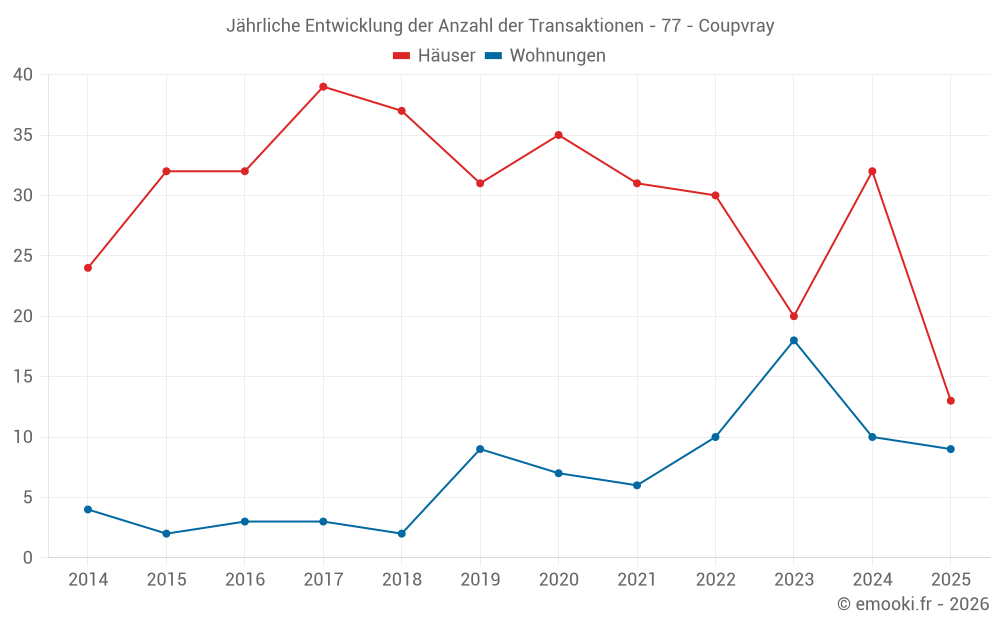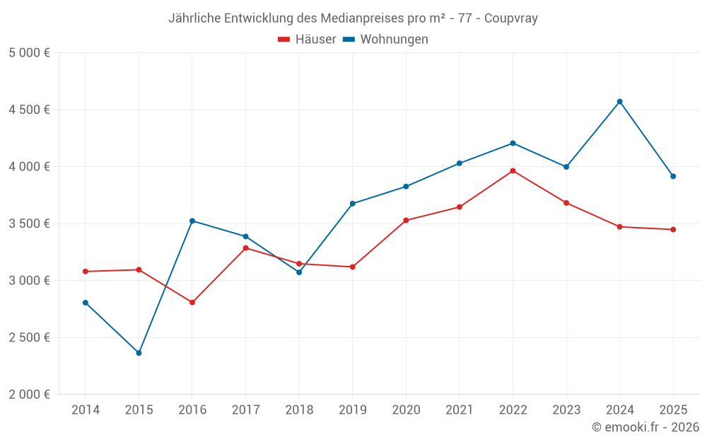 Der Durchschnittspreis auf den 29 Wohnungstransaktionen der letzten 24 Monate in der Gemeinde Coupvray betrug 4 020 € pro Quadratmeter für einen mittleren Immobilienwert von 231 000 €. Über diesen Zeitraum hinweg lagen 60% der Transaktionen zwischen 3 712 und 4 686 € pro Quadratmeter (vom 2. bis zum 8. Dezil).
