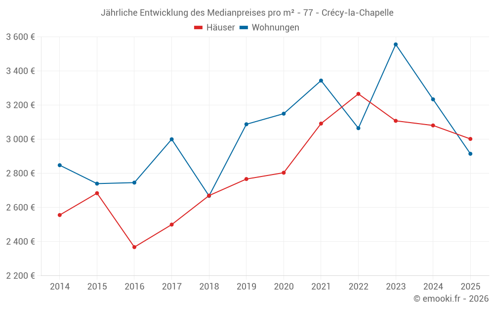Der Durchschnittspreis auf den 34 Wohnungstransaktionen der letzten 24 Monate in der Gemeinde Crécy-la-Chapelle betrug 3 296 € pro Quadratmeter für einen mittleren Immobilienwert von 147 918 €. Über diesen Zeitraum hinweg lagen 60% der Transaktionen zwischen 2 897 und 3 771 € pro Quadratmeter (vom 2. bis zum 8. Dezil).
