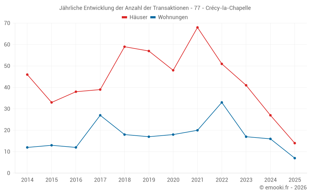 Der Durchschnittspreis auf den 29 Hausgeschäften der letzten 12 Monate in der Gemeinde Crécy-la-Chapelle betrug 3 039 € pro Quadratmeter für einen mittleren Immobilienwert von 298 000 €. Über diesen Zeitraum hinweg lagen 60% der Transaktionen zwischen 2 367 und 3 656 € pro Quadratmeter (vom 2. bis zum 8. Dezil).