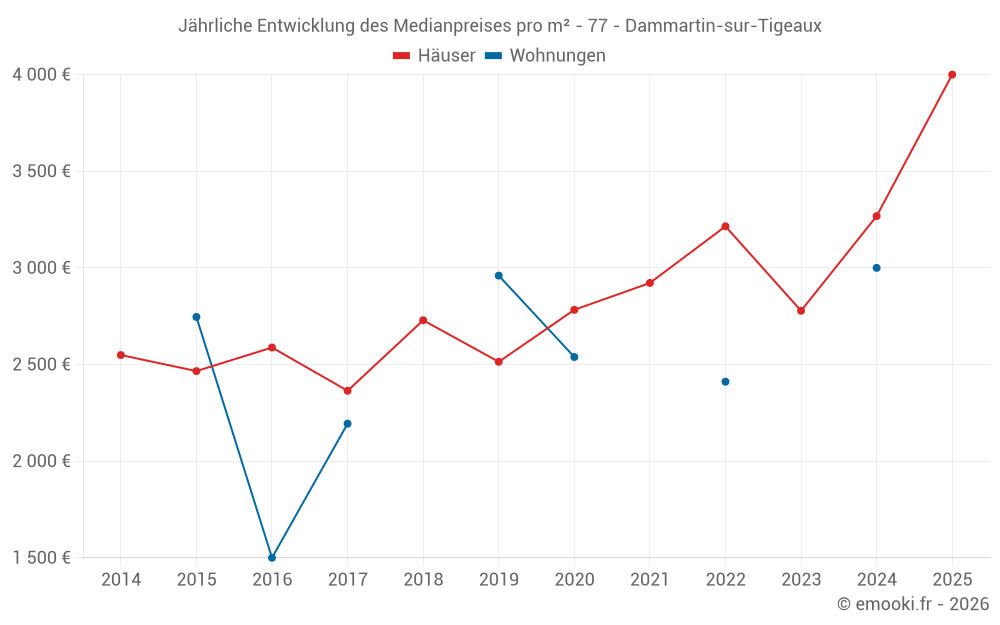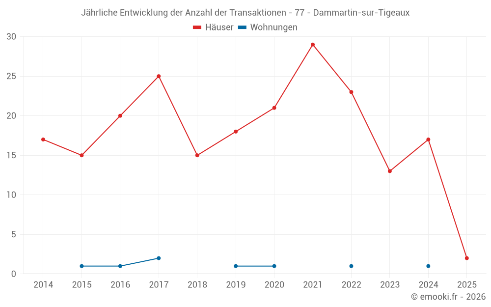 Der Durchschnittspreis auf den 27 Hausgeschäften der letzten 24 Monate in der Gemeinde Dammartin-sur-Tigeaux betrug 3 268 € pro Quadratmeter für einen mittleren Immobilienwert von 307 000 €. Über diesen Zeitraum hinweg lagen 60% der Transaktionen zwischen 2 552 und 3 743 € pro Quadratmeter (vom 2. bis zum 8. Dezil).