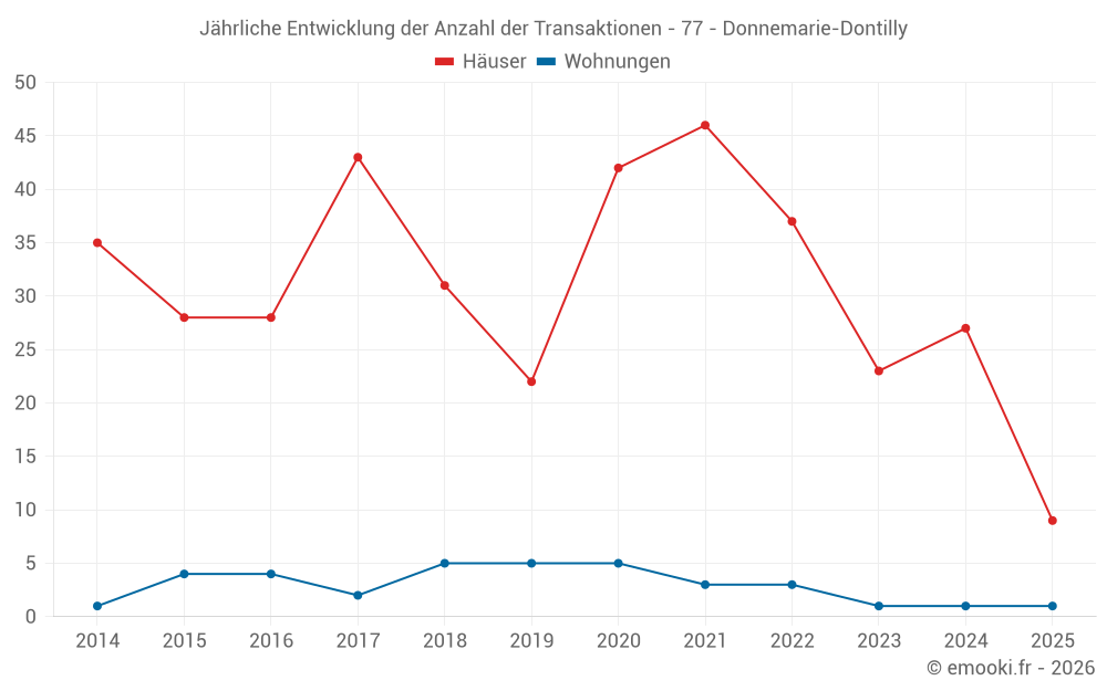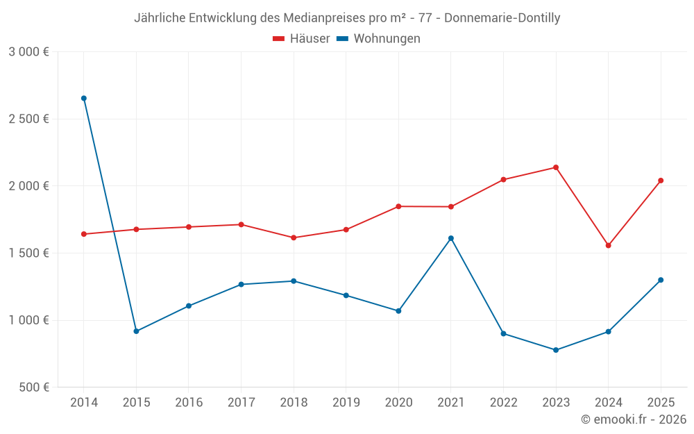 Der Durchschnittspreis auf den 22 Hausgeschäften der letzten 12 Monate in der Gemeinde Donnemarie-Dontilly betrug 1 642 € pro Quadratmeter für einen mittleren Immobilienwert von 188 000 €. Über diesen Zeitraum hinweg lagen 60% der Transaktionen zwischen 1 174 und 2 389 € pro Quadratmeter (vom 2. bis zum 8. Dezil).